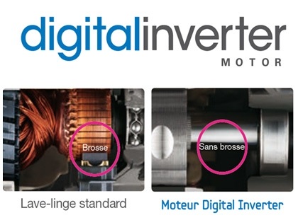 D finition de Digital Inverter (Samsung) Sur les lave-linges s che-linges dot s daposun moteur Digital Inverter, les brosses (ou balais) ne sont plus n cessaires, ce qui permet daposatt nuer la friction et, de ce fait, les vibrations de la machine, la rendant plus silencieuse durant le fonctionnement et, daposapr s le constructeur, prolongeant sa dur e de vie. Caposest un compresseur dot dun moteur courant continu dont laposalimentation permet daposavoir une tension continue mais partir daposune source de tension alternative. Sur les lave-linge, les missions sonores varient entre dB et dB, contre au-dessus de dB pour les appareils quip s de moteurs classiques. Le nouveau moteur att nue la friction, ce qui permet de r duire le bruit et les vibrations.
